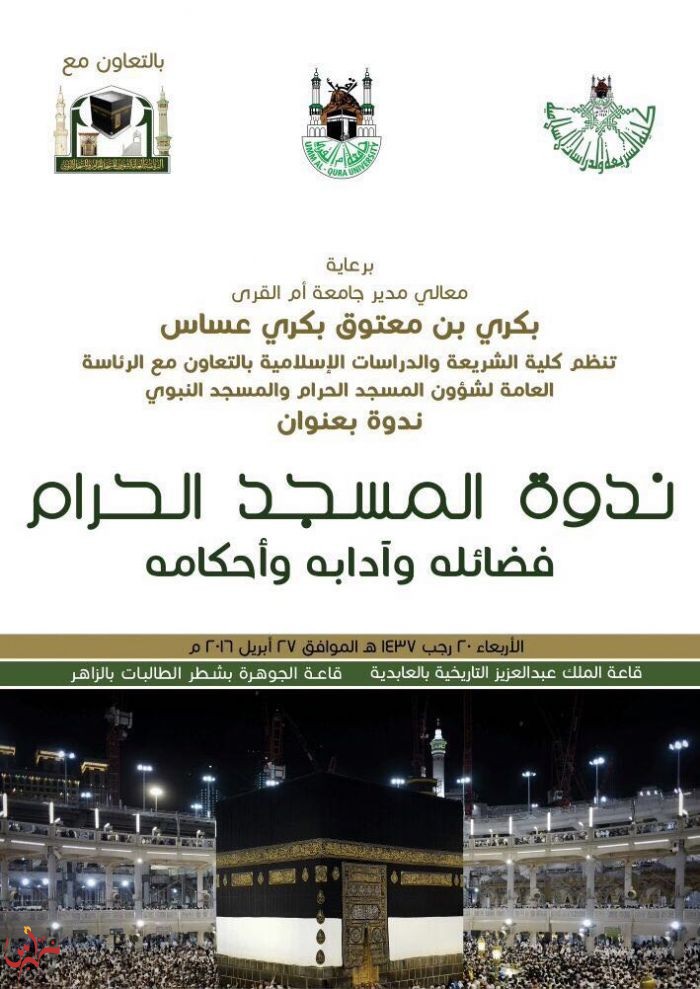 يرعى معالي مدير جامعة أم القرى الدكتور بكري بن معتوق بكري عساس فعاليات ندوة "المسجد الحرام فضائله وآدابه وأحكامه" والتي تنظمها كلية الشريعة والدراسات الإسلامية بجامعة أم القرى بالتعاون مع الرئاسة العامة لشؤون المسجد الحرام والمسجد النبوي بقاعة الجوهرة بشطر الطالبات بالزاهر وقاعة الملك عبد العزيز التاريخية بالعابدية صباح يوم الأربعاء الموافق ٢٠ شهر رجب ١٤٣٧هـ الموافق ٢٧ ابريل ٢٠١٦م .