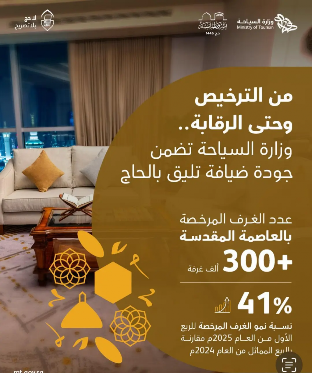ويأتي النمو المتزايد في أعداد الغرف المرخصة بمرافق الضيافة في مدينة مكة المكرمة، نتاجًا لجهود وزارة السياحة المتواصلة؛ لضمان تقديم خدمات ذات جودة عالية لضيوف الرحمن بالتزامن مع موسم حج 1446هـ، وذلك في إطار جهودها التكاملية والتشاركية مع الجهات الحكومية ذات الصلة؛ لتوفير كل سبل الراحة لحجاج بيت الله الحرام من أجل أن يؤدوا مناسكهم بكل يُسرٍ وطمأنينة.