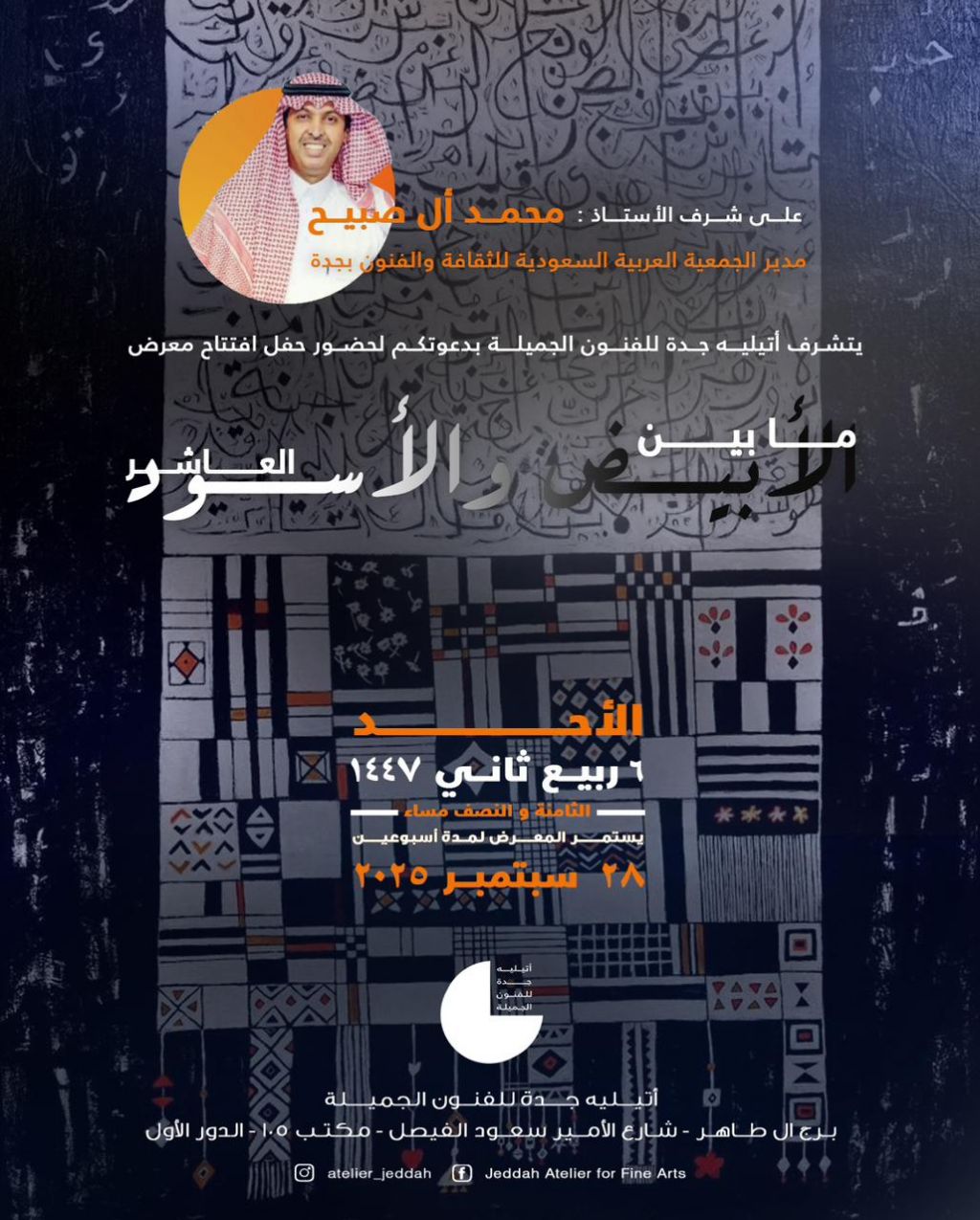 يقدم معرض بين الأبيض والأسود فيما يحل حامد ندا كضيف شرف المعرض يفتتح الأستاذ محمد ال صبيح رئيس الجمعية العربية السعودية للثقافة والفنون بجدة معرض بين الأبيض والأسود يوم الاحد المقبل الموافق ٢٨ سبتمبر الجاري في قاعة أتيليه جدة للفنون الجميلة ببرج ال طاهر شارع الأمير سعود الفيصل وستكون هناك ثلاثة أعمال مشاركة في هذا المعرض للفنان الكبير حامد ندا. ويستمر المعرض لمدة أسبوعين ويعقبه مباشرة سلسلة من المعارض الشخصية والجماعية .