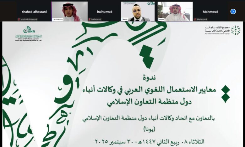 نظم اتحاد وكالات أنباء دول منظمة التعاون الإسلامي “يونا”، بالتعاون مع مجمع الملك سلمان العالمي للغة العربية، اليوم الثلاثاء 30 سبتمبر 2025، ندوة افتراضية بعنوان “معايير الاستعمال اللغوي العربي في وكالات أنباء دول منظمة التعاون الإسلامي”، بمشاركة واسعة من ممثلي وكالات الأنباء الأعضاء في دول المنظمة وعدد من الإعلاميين من مختلف الجهات.