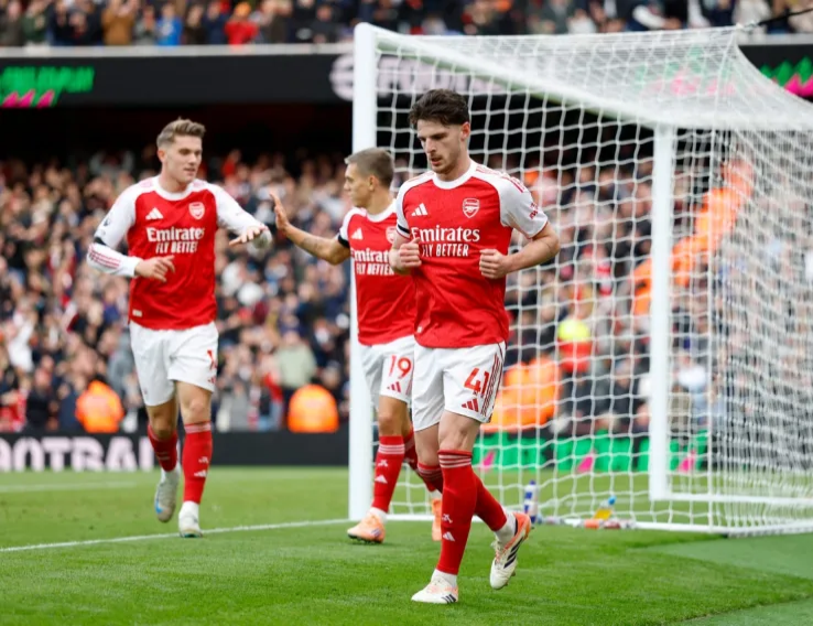 تقدم أرسنال في الدقيقة 38 من هجمة منظمة أنهاها إبريتشي إيزي بتسديدة من داخل المنطقة تصدى لها الحارس بصعوبة لترتد وتجد متابعة من رايس بتسديدة مباشرة في الشباك.