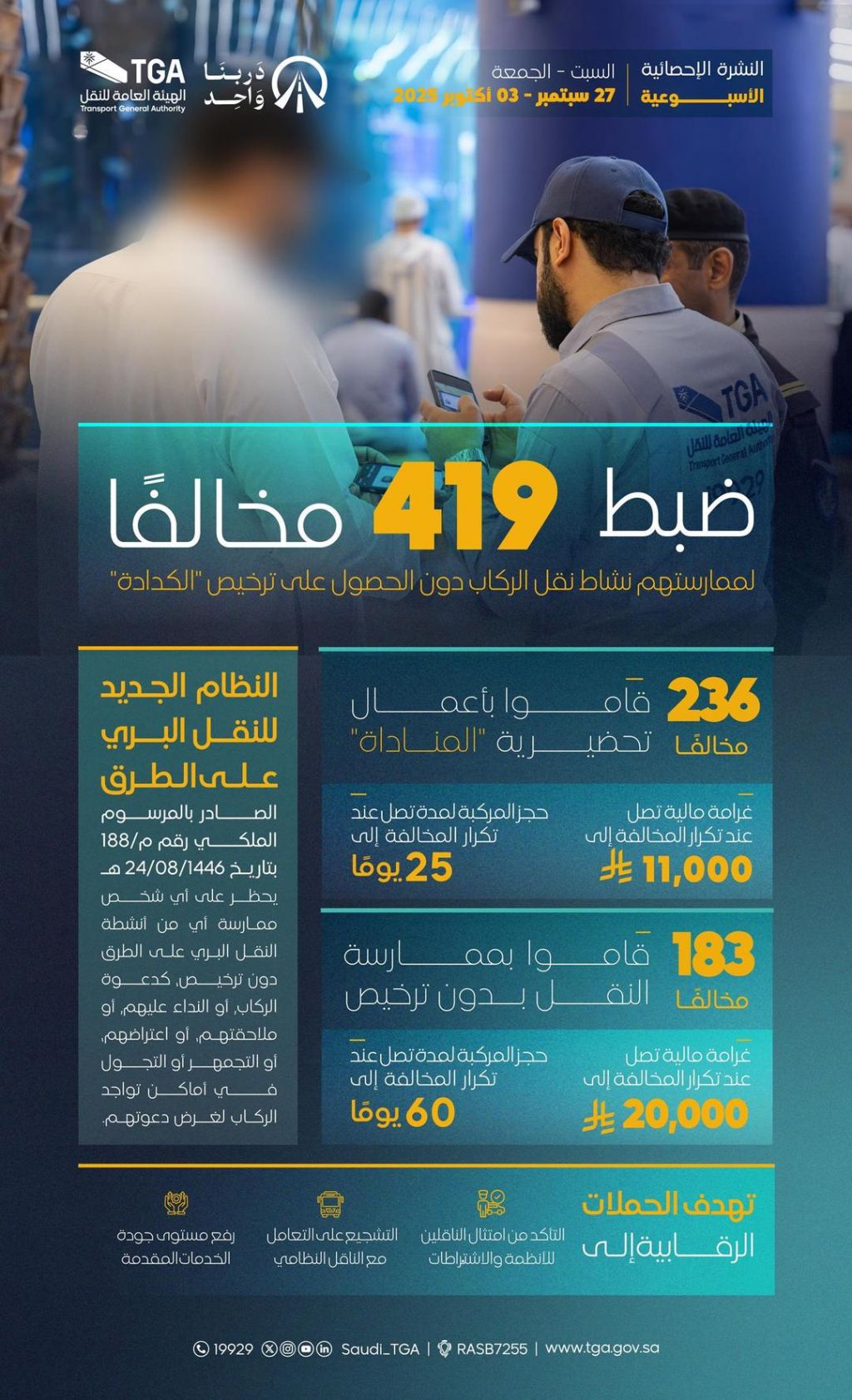 واصلت الفرق الرقابية في الهيئة العامة للنقل جولاتها التفتيشية، وضبطت خلال الفترة من السبت حتى الجمعة الموافق (27) سبتمبر الماضي حتى (3) أكتوبر الجاري، (419) مخالفًا، أوقعت بحقهم الإجراءات النظامية التي تتضمن حجز المركبات وغرامات مالية؛ لممارستهم نشاط نقل الركاب دون الحصول على ترخيص "الكدادة"، وذلك في مختلف مناطق المملكة، بالتعاون مع عدد من الجهات المعنية.