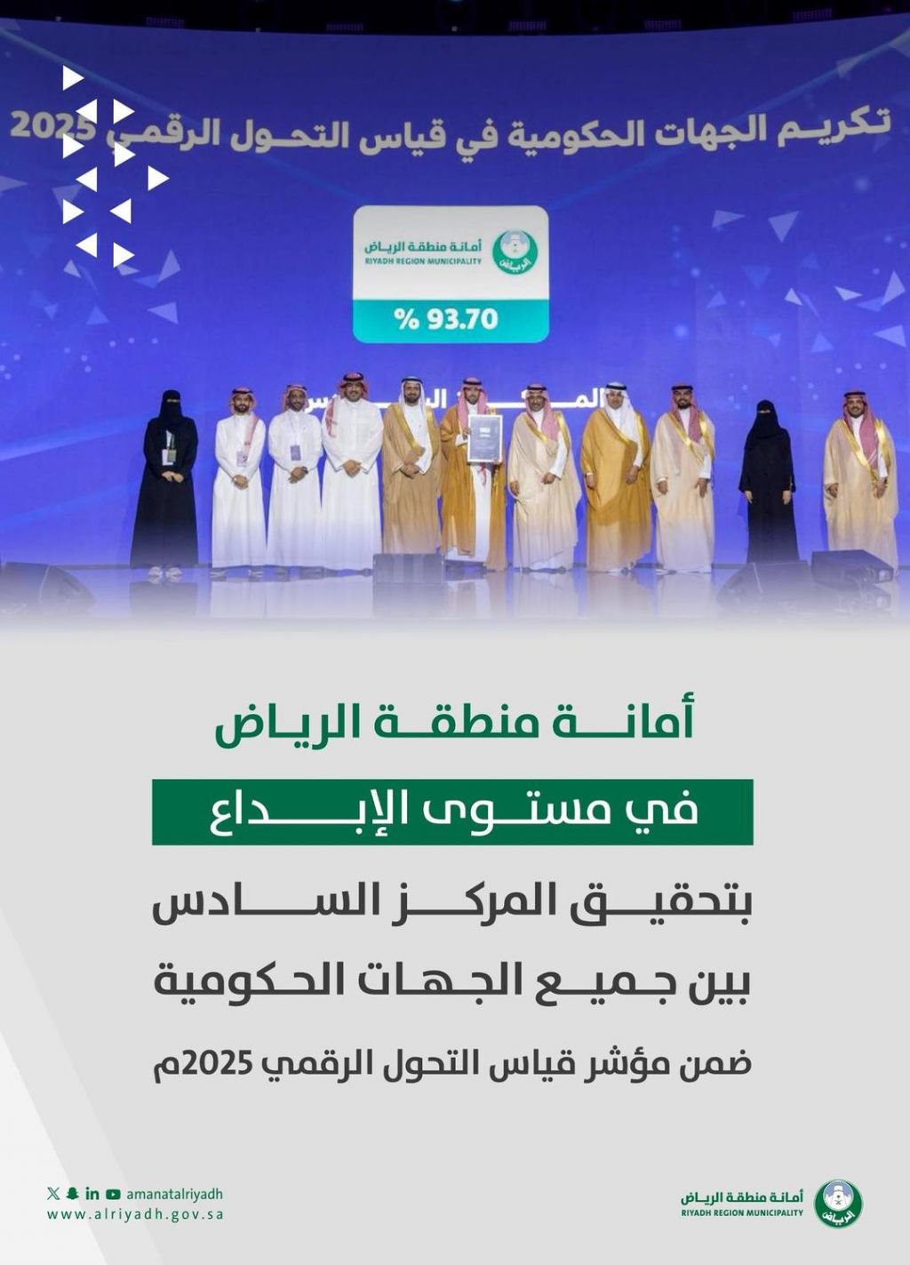 حققت أمانة منطقة الرياض المركز السادس على مستوى الجهات الحكومية في مرحلة الإبداع ضمن قياس التحول الرقمي 2025, الذي أطلقته هيئة الحكومة الرقمية، تأكيدًا لتقدمها في تطوير خدماتها الرقمية وتبنّيها التقنيات الحديثة التي تسهم في تحسين تجربة المستفيدين ورفع كفاءة الأداء البلدي.