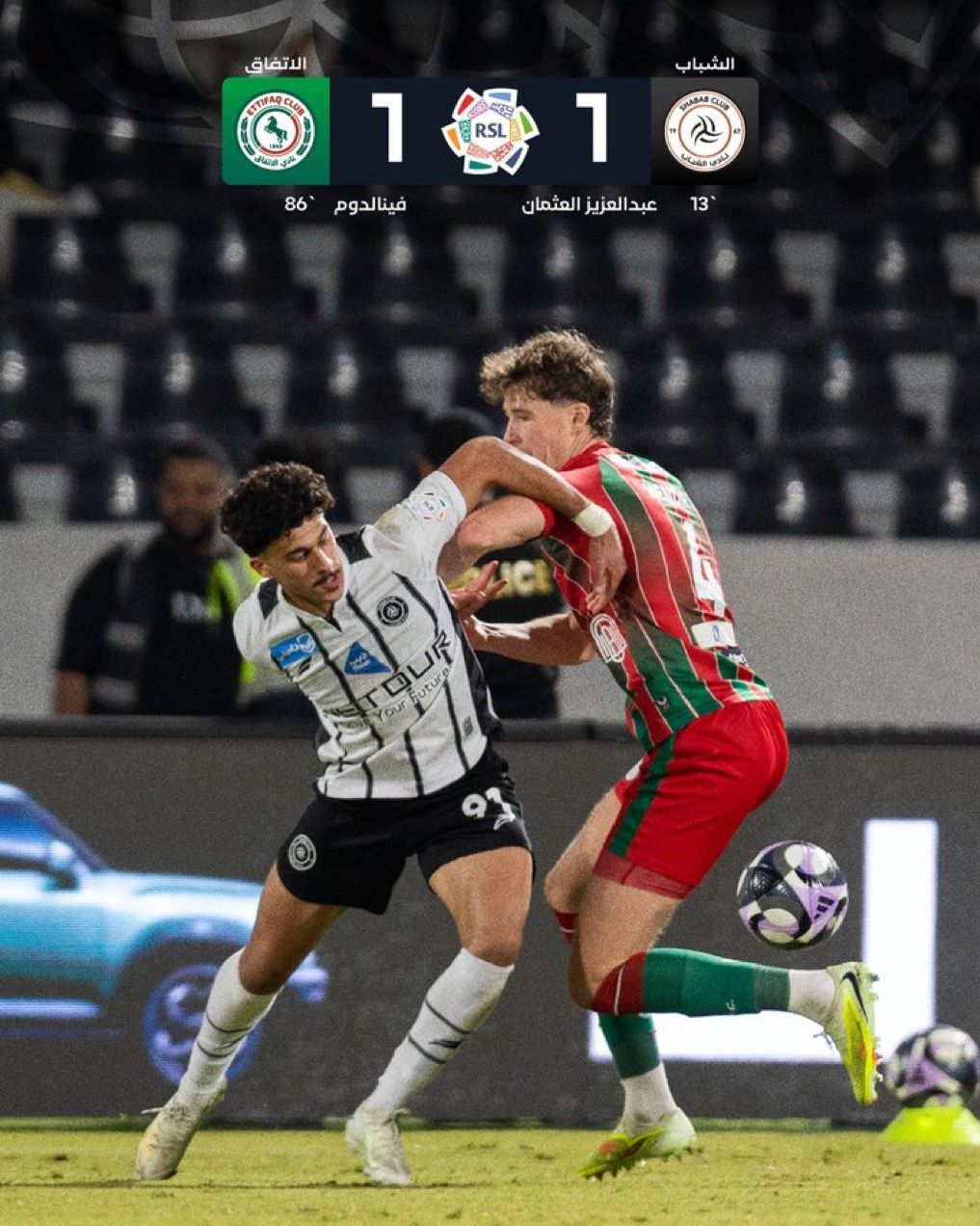 وسجّل عبدالعزيز العثمان هدف الشباب في الدقيقة 13، قبل أن يدرك جورجينيو فينالدوم التعادل للاتفاق في الدقيقة 86 من ركلة جزاء.