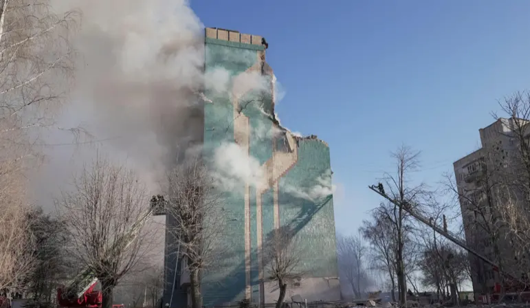 وأظهر مقطع فيديو نشره زيلينسكي انهيار أحد البرجين السكنيين بالكامل. وقال وزير الداخلية إيغور كليمنكو إن المبنى دُمر بالكامل بين الطابقين الثالث والتاسع.