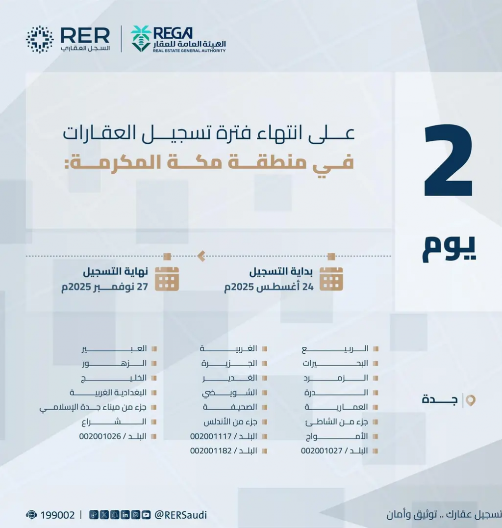 أعلنت الهيئة العامة للعقار عن قرب انتهاء المهلة المحددة للتسجيل العيني الأول للعقار لـ(54,062) قطعة عقارية في (4) أحياء بمنطقة مكة المكرمة في محافظة جدة، و(32) حيًا في محافظة الأحساء و(10) أحياء في محافظة الجبيل، و(10) أحياء في محافظة رأس تنورة بالمنطقة الشرقية، وذلك بنهاية يوم الخميس 6 جمادى الآخر 1447هــ، الموافق 27 نوفمبر 2025م.