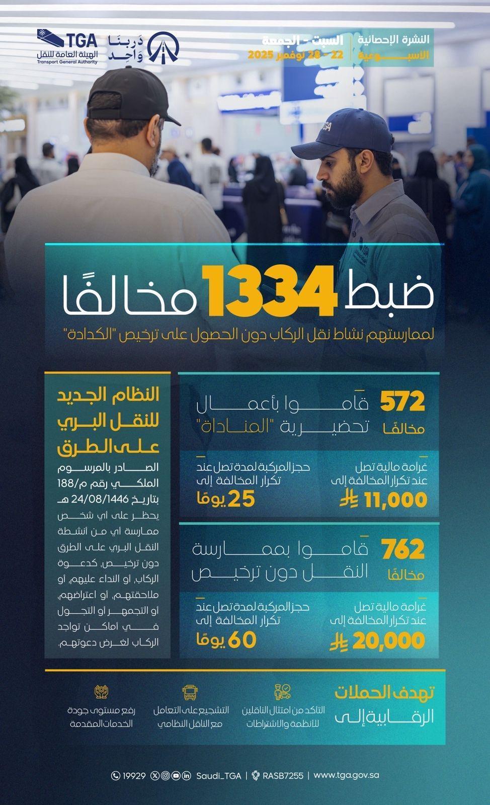 واصلت الفرق الرقابية في الهيئة العامة للنقل جولاتها التفتيشية، إذ ضبطت خلال الفترة من السبت حتى الجمعة الموافق 22 نوفمبر الجاري حتى 28 من شهر ذاته، (1334) مخالفًا، أوقعت بحقهم الإجراءات النظامية التي تتضمن حجز المركبات وغرامات مالية؛ لممارستهم نشاط نقل الركاب دون الحصول على ترخيص "الكدادة"، وذلك في مختلف مناطق المملكة، بالتعاون مع عدد من الجهات المعنية.