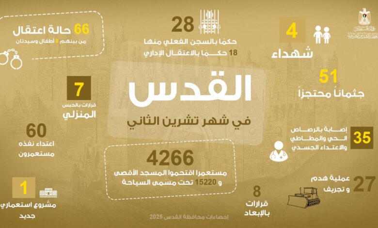 وشهدت محافظة القدس المحتلة خلال شهر تشرين الثاني/نوفمبر 2025، تصعيدًا ممنهجًا في الاعتداءات الإسرائيلية التي طالت المؤسسات الدينية، والثقافية، والإعلامية، والاجتماعية، إلى جانب ملاحقة القيادات الوطنية والدينية، في إطار سياسة تهدف إلى إحكام السيطرة على المشهد المدني والروحي في المدينة وتقويض حضورها الفلسطيني.