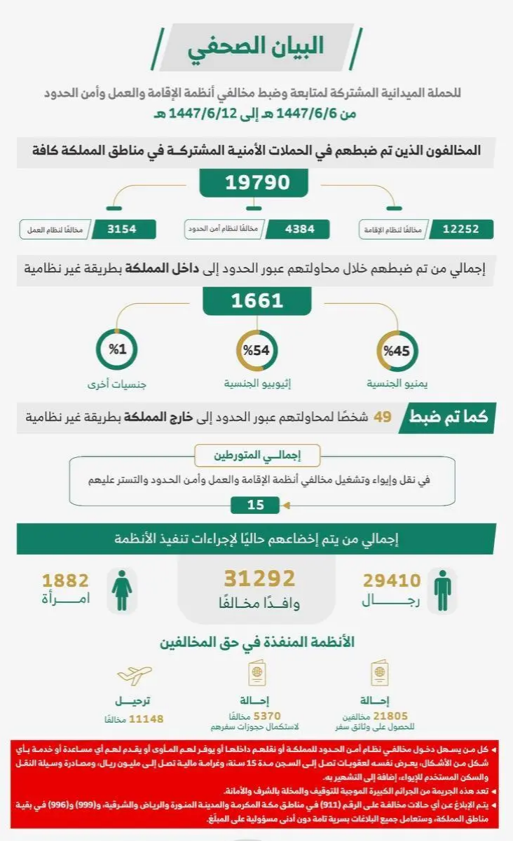 أولًا: بلغ إجمالي المخالفين الذين تم ضبطهم بالحملات الميدانية الأمنية المشتركة في مناطق المملكة كافة (19790) مخالفًا، منهم (12252) مخالفًا لنظام الإقامة، و(4384) مخالفًا لنظام أمن الحدود، و(3154) مخالفًا لنظام العمل.