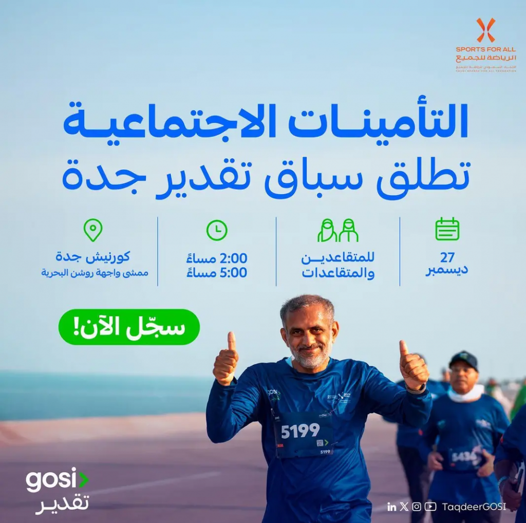 تنظم المؤسسة العامة للتأمينات الاجتماعية الجولة الرابعة من سباق "تقدير" للمشي للمتقاعدين، وذلك يوم السبت الموافق 27 ديسمبر 2025، في كورنيش جدة ممشى واجهة روشن البحرية بمدينة جدة، ضمن جهودها الرامية إلى تعزيز علاقتها بالمتقاعدين، وتفعيل دورها في تقديم مبادرات اجتماعية وصحية تسهم في تحسين جودة حياتهم بعد التقاعد.