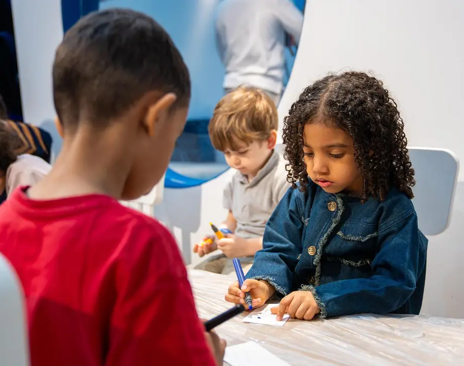 فمنذ اللحظات الأولى لافتتاح الورش، يتوافد الأطفال من عمر 3 إلى 10 أعوام، ليخوضوا رحلة إبداعية تمتد على مدار اليوم، تجمع الرسم الحر، والتلوين، وصناعة مجسّمات ثلاثية الأبعاد.