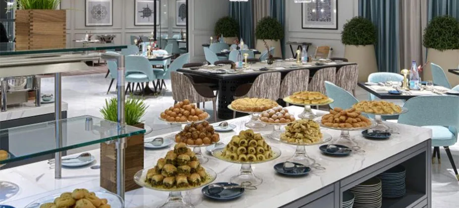 وتستمر التجربة مع مجموعة من الحلويات المستوحاة من المطبخ المغربي التقليدي، حيث يقدّم بسكويت العسل والسمسم، والغريبة الناعمة، والبسبوسة، لتضفي لمسة من الحلاوة الدافئة وتنوّعاً في القوام، مقدّمة لكل ضيف مذاقاً أصيلاً من التراث. كما تكتمل التجربة مع خدمة الشاي المغربي بالنعناع المعدّ مباشرة أمام الضيوف، حيث يُسكب بأسلوب استعراضي أنيق، ناشراً عبير النعناع المنعش في المكان، ليختتم الأمسية بنغمة دافئة وعطرة لا تنسى.