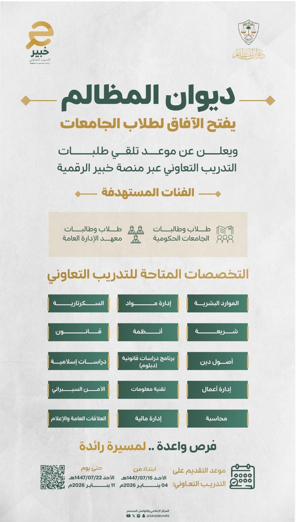 وأفاد الديوان أن فترة التقديم ستكون من (4 يناير 2026م حتى 11 يناير 2026م)، على أن تبدأ فترة التدريب في (20 يناير 2026م)، إذ تتيح المنصة فرصة التدريب في محاكم ديوان المظالم وإداراته والمرافق التابعة له.
