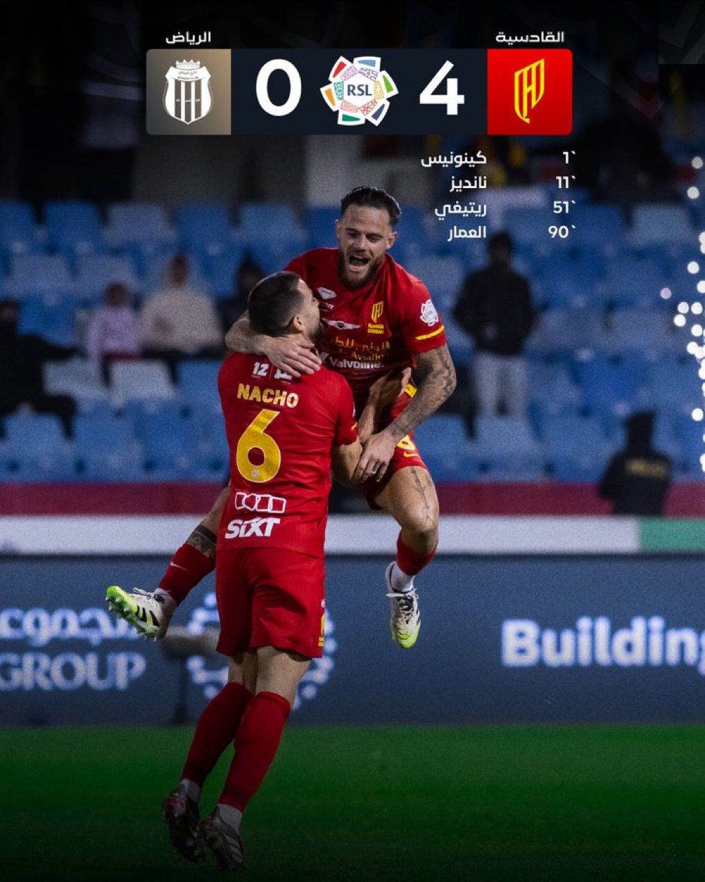 سجل رباعية القادسية كل من خوليان كينيونيس وناهيتان نانديز وماتيو ريتيغي وتركي العمار في الدقائق 1 و11 و51 و90+1 من عمر المباراة.