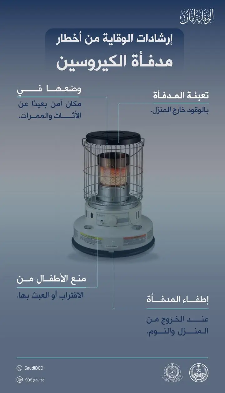 أكدت المديرية العامة للدفاع المدني اتباع إجراءات السلامة عند استخدام مدفأة الكيروسين، وضرورة تعبئتها بالوقود خارج المنزل، ومنع الأطفال من الاقتراب أو العبث بها، وإطفائها عند الخروج من المنزل أو عند النوم، ووضعها في مكان آمن وبعيد عن الأثاث والممرات.