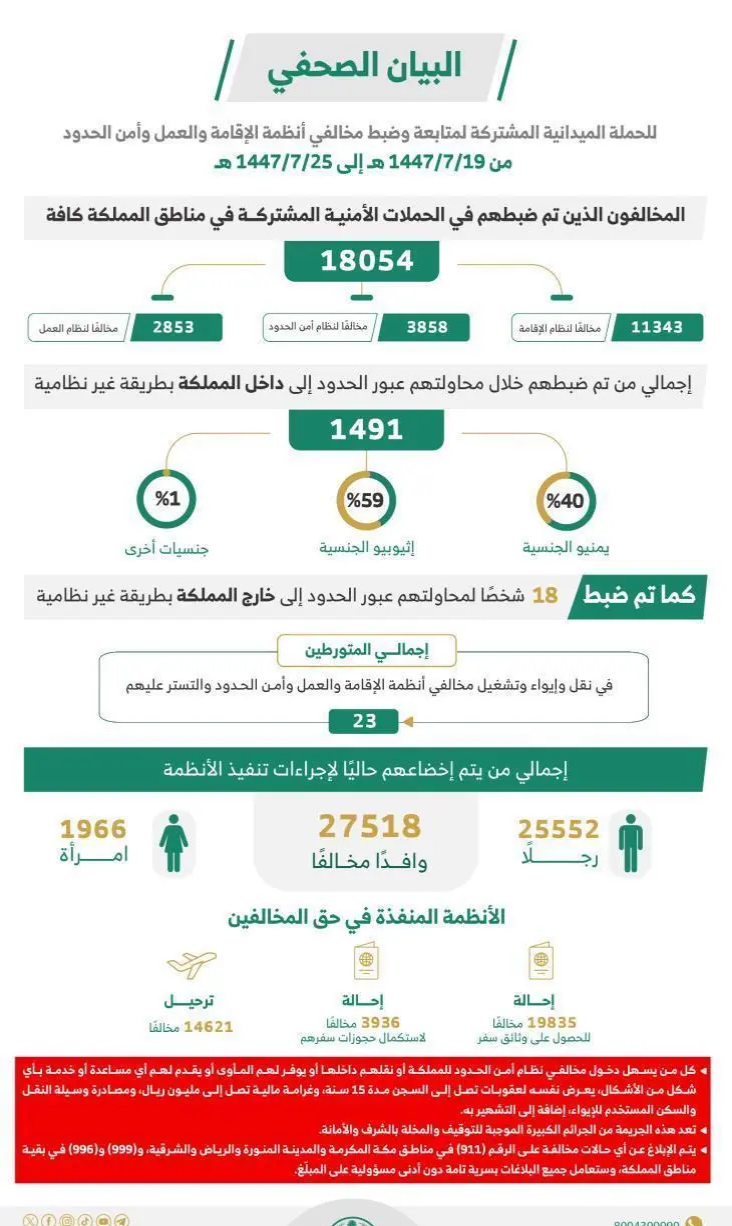 رابعًا: بلغ إجمالي من يتم إخضاعهم حاليًا لإجراءات تنفيذ الأنظمة (27518) وافدًا مخالفًا، منهم (25552) رجلاً، و(1966) امرأة.