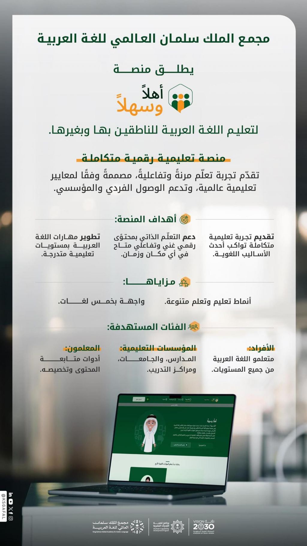 وتأتي هذه المبادرة في إطار تحقيق مستهدفات برنامج تنمية القدرات البشرية؛ لبناء منظومة تعليم رقمي عربية متقدّمة، تجمع بين الجودة الأكاديمية والابتكار التقني، وللاطلاع على المنصة زيارة الرابط التالي: https://ahlan.ksaa.gov.sa/ar/web/home.
