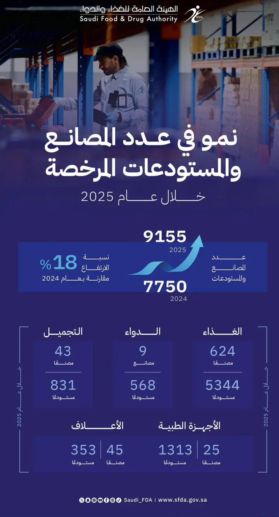 وأظهرت الإحصائية ارتفاع إجمالي عدد المصانع والمستودعات المرخصة إلى (9155) منشأة خلال عام 2025م، مقارنة بـ(7750) منشأة في عام 2024م.