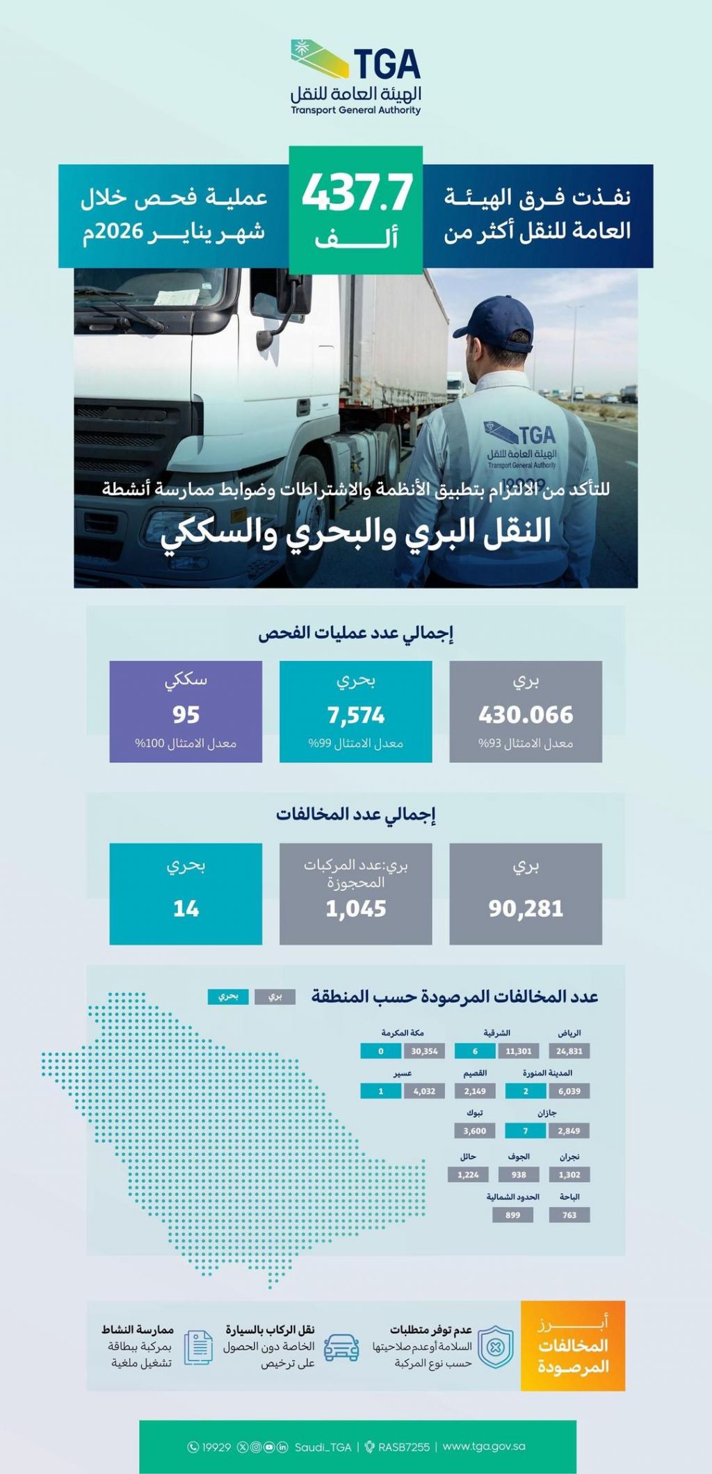 تواصل الهيئة العامة للنقل ممثلةً بفرقها الرقابية جولاتها الميدانية في أنشطة النقل البري والبحري والسككي بالمملكة، إذ نفذت خلال شهر يناير أكثر من 437,735 عملية فحص، نتج عنها 90,295 مخالفة، وذلك ضمن جهودها المتواصلة لرفع مستوى جودة الخدمات المقدمة وتعزيز اشتراطات السلامة.