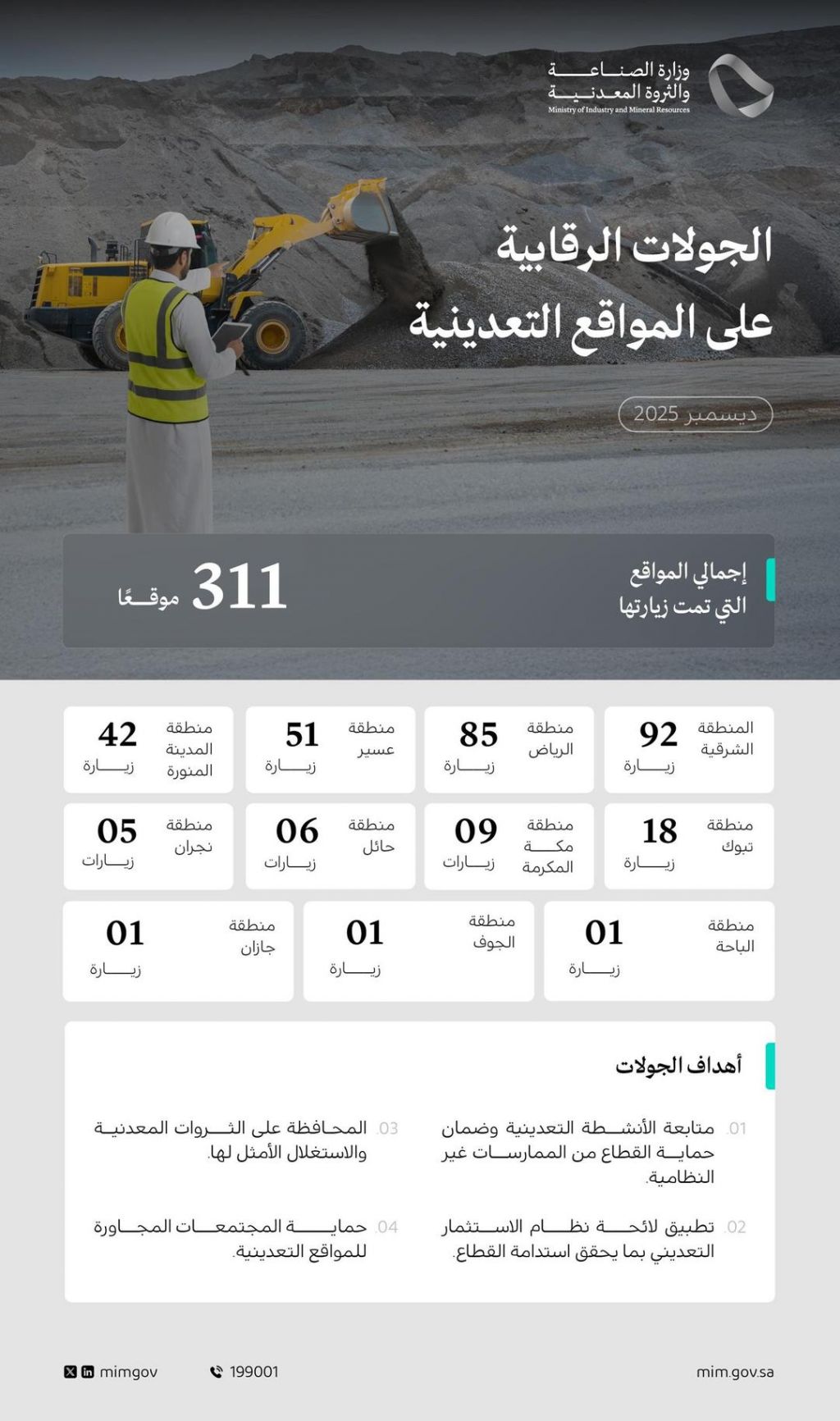 نفذت وزارة الصناعة والثروة المعدنية -ممثلة في وكالة الإشراف على العمليات التعدينية- 311 جولة رقابية على عددٍ من المواقع التعدينية في مختلف مناطق المملكة خلال شهر ديسمبر 2025.