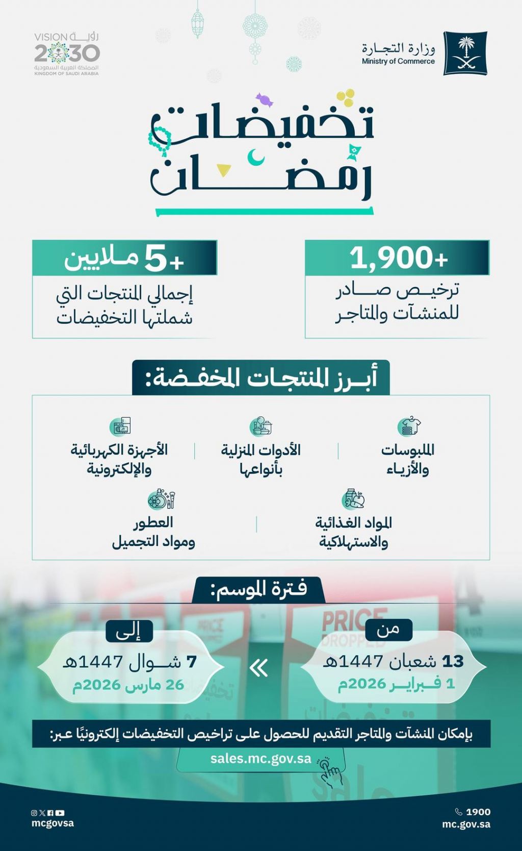 أصدرت وزارة التجارة 1,987 ترخيصًا للتخفيضات والعروض الترويجية للمنشآت التجارية والمتاجر الإلكترونية في مختلف مناطق المملكة، ضمن موسم "تخفيضات رمضان" الذي انطلق في 13 شعبان الجاري، ويستمر حتى بعد عيد الفطر، ويشمل السلع والمنتجات الرمضانية ومستلزمات العيد.