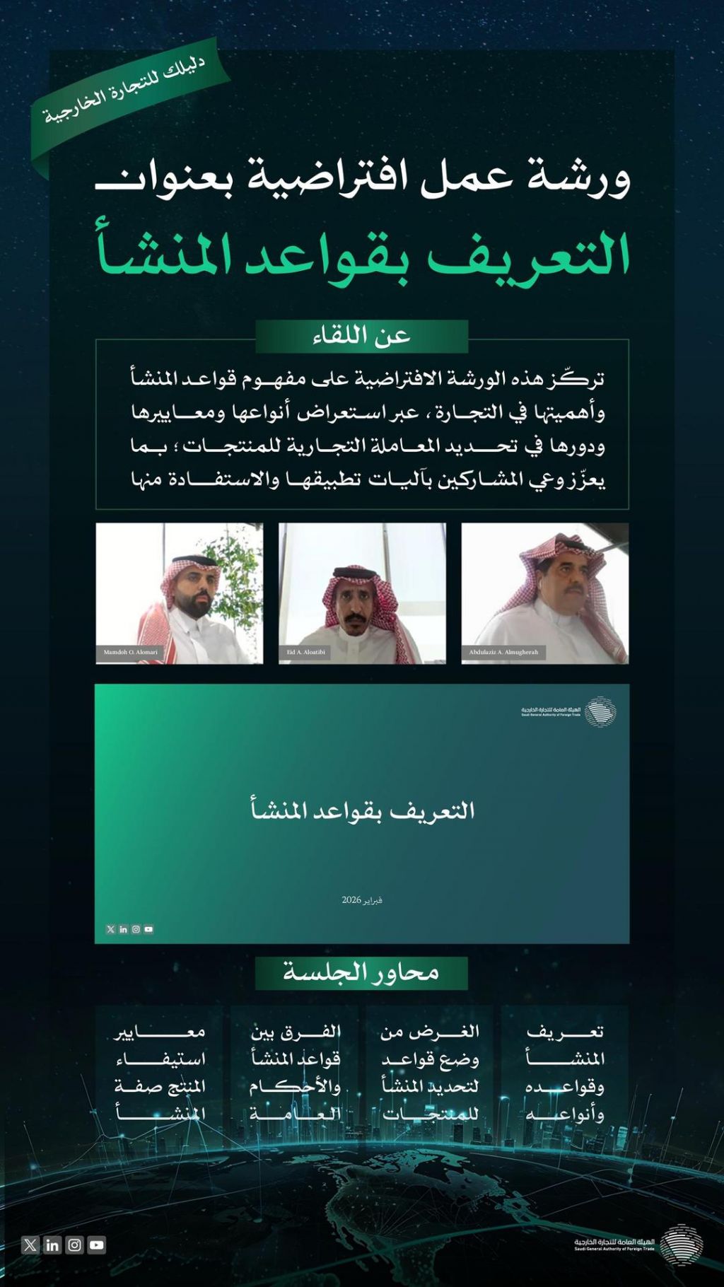 نظّمت الهيئة العامة للتجارة الخارجية، اليوم، ورشة عمل افتراضية؛ للتعريف بقواعد المنشأ، بحضور ومشاركة أكثر من 70 ممثلًا من القطاع الخاص في مختلف المجالات، وذلك في إطار جهود الهيئة المستمرة لتعزيز الوعي بالأنظمة التجارية الدولية.