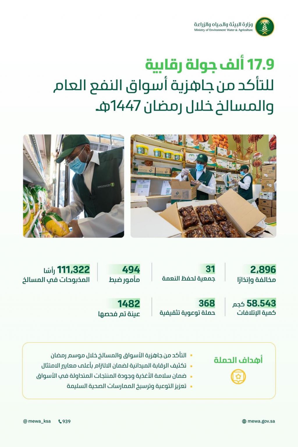 نفذت وزارة البيئة والمياه والزراعة خلال الأسبوع الثاني من شهر فبراير الجاري حملة رقابية في أسواق النفع العام والمسالخ في جميع مناطق المملكة؛ للتأكد من جاهزية الأسواق والمسالخ خلال شهر رمضان المبارك 1447هـ، أسفرت عن زيارة 17,948 منشأة، وإصدار 2,896 مخالفة وإنذارًا.