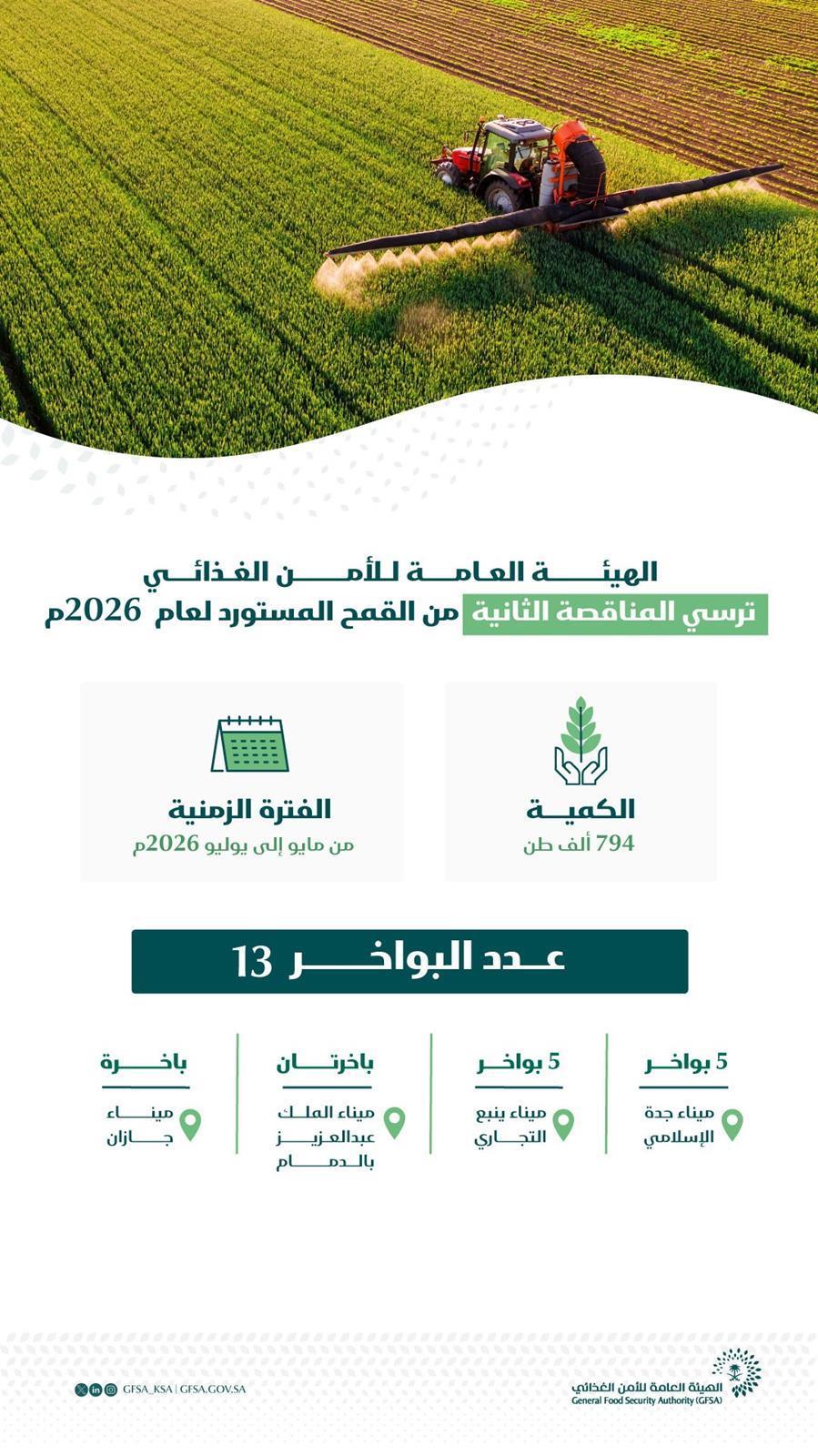 أتمت الهيئة العامة للأمن الغذائي إجراءات ترسية الدفعة الثانية من القمح المستورد لهذا العام (2026م) بكمية (794.000) طن للتوريد من مناشئ (الاتحاد الأوروبي، وأمريكا الشمالية والجنوبية، وأستراليا، والبحر الأسود).