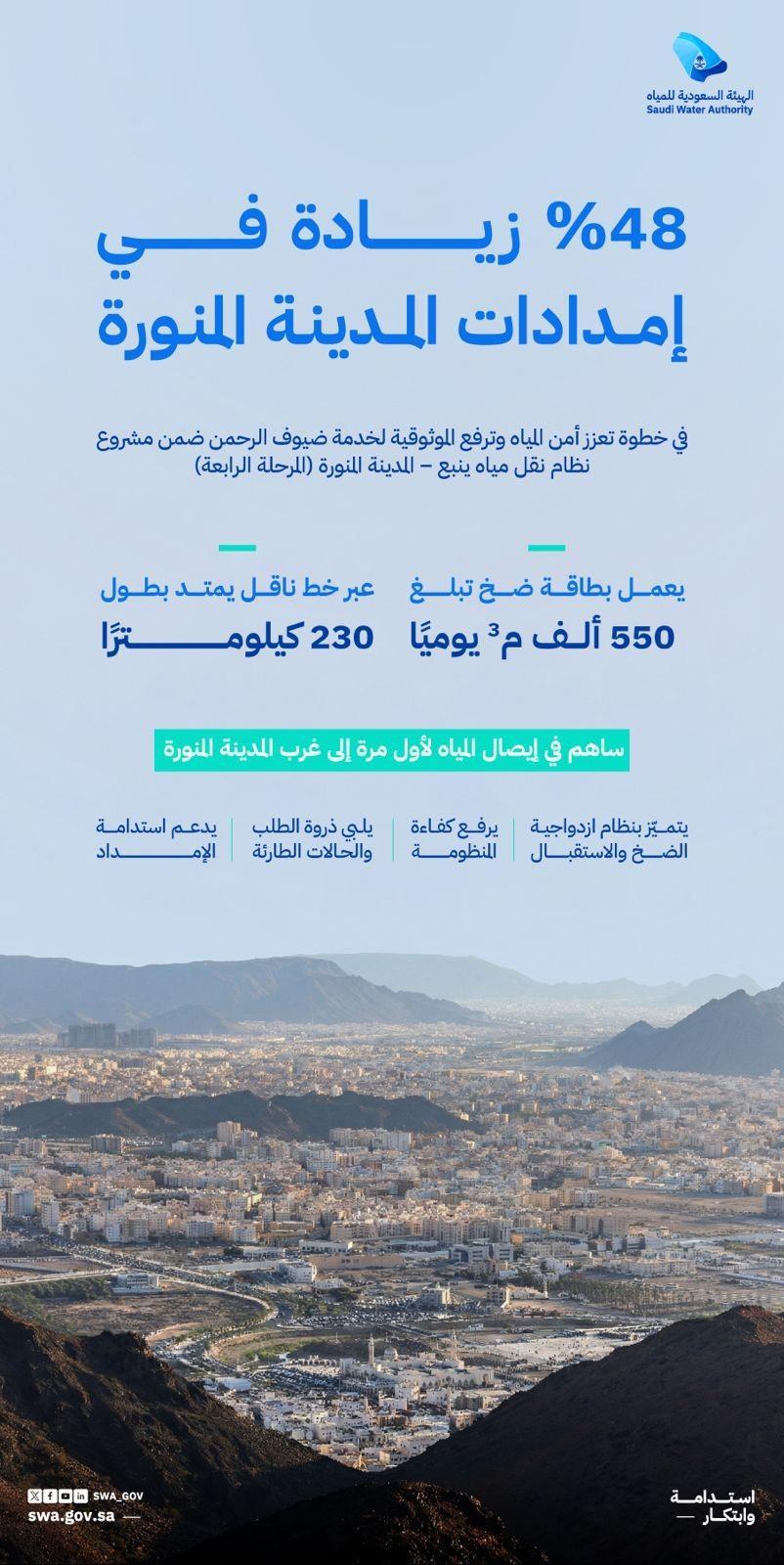 وأوضحت أن المشروع يعمل بطاقة ضخ تبلغ 550 ألف متر مكعب يوميًا، عبر خط ناقل يمتد بطول 230 كيلومترًا؛ مما أسهم في زيادة تغذية المدينة المنورة بنسبة 48%، ودعم استقرار الإمداد ورفع كفاءة المنظومة في مواجهة ذروة الطلب والحالات الطارئة.