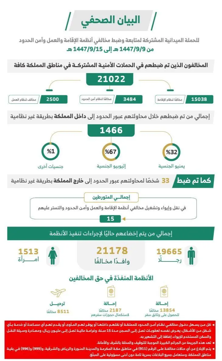 أولًا: بلغ إجمالي المخالفين الذين تم ضبطهم بالحملات الميدانية الأمنية المشتركة في مناطق المملكة كافة (21022) مخالفًا، منهم (15038) مخالفًا لنظام الإقامة، و(3484) مخالفًا لنظام أمن الحدود، و(2500) مخالف لنظام العمل.