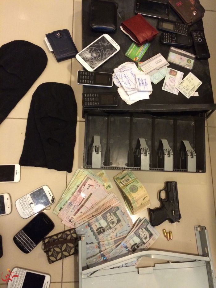 أوضح الناطق الإعلامي بشرطة منطقة الرياض انه الحاقاً للخبر المنشور يوم الاربعاء 1/4/1436هـ تحت عنوان " إدارة التحريات بشرطة الرياض تكشف هوية عصابة السطو على كاشيرات المحال التجارية بمدينة الرياض " حين تمكنت إدارة التحريات والبحث الجنائي بشرطة الرياض من القبض على أربعة جناة اقدموا على ارتداء اقنعة لإخفاء شخصياتهم وسرقة عدة محلات ومتاجر بالاكراه شمال وشرق العاصمة الرياض وبحوزتهم أسلحة نارية وبيضاء ومن ثم سرقة صناديق المحاسبة ( الكاشير ) بما فيها من نقود والفرار وقد تم تداول بعضاَ من جرائمهم على مواقع التواصل الاجتماعي .