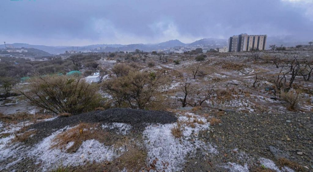 اكتست شوارع ومرتفعات مدينة الباحة اليوم بحبات البَرَد، في مشهد نادر أضفى طابعًا شتويًا لافتًا، تزامن مع هطول أمطار غزيرة شملت عددًا من الأحياء والطرق الرئيسة.