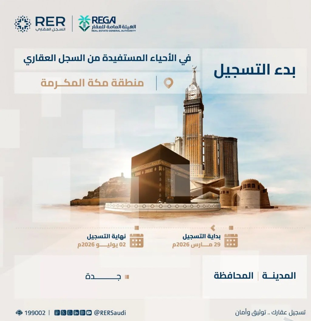 أعلن السجل العقاري اليوم، عن بدء استقبال طلبات التسجيل العيني الأول لـ(14,750) قطعة عقارية في منطقة مكة المكرمة، ويشمل التسجيل الأحياء في محافظة جدة وهي: (حي الريان، جزء من حي السلامة، جزء من حي الخالدية، جزء من حي القوزين، جزء من حي الوادي).