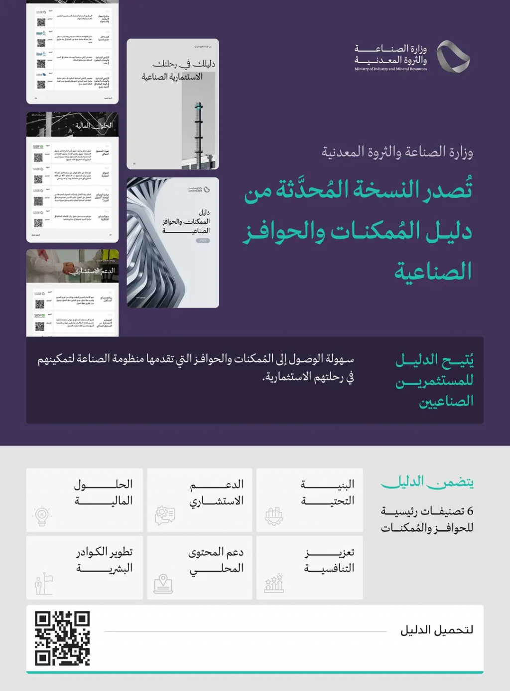 ويمكن للمستثمرين الصناعيين والمهتمين الاطلاع على النسخة المحدّثة من دليل الممكنات والحوافز الصناعية المقدّمة من منظومة الصناعة، وذلك عبر الرابط: http://cdn.mim.gov.sa/u/PaIx98.