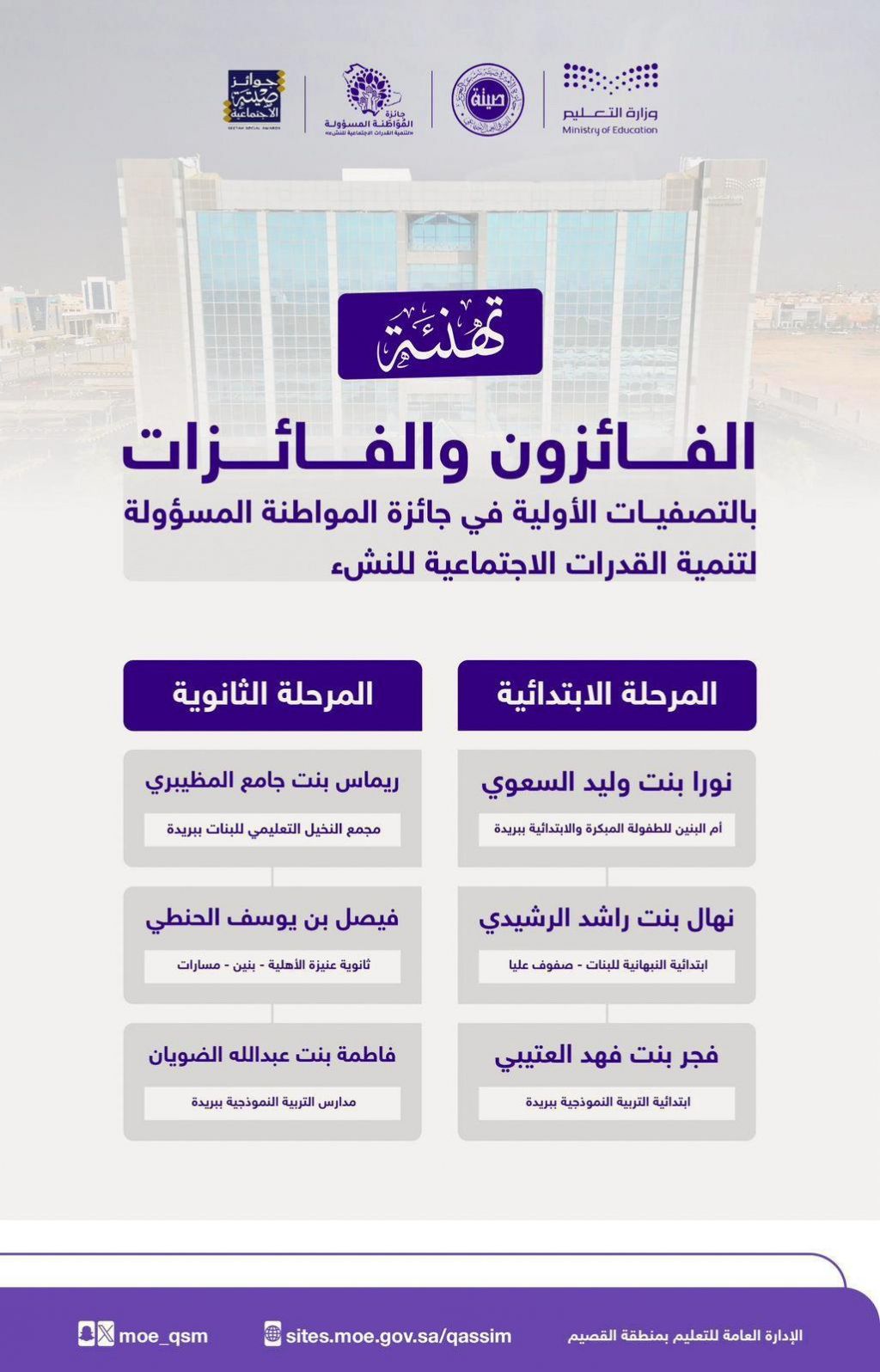 هنأت إدارة تعليم القصيم طلابها وطالباتها الفائزين والفائزات في التصفيات الأولية لـ"جائزة المواطنة المسؤولة لتنمية القدرات الاجتماعية للنشء"، وذلك في إطار دعمها المستمر للمبادرات الوطنية الهادفة إلى تعزيز القيم وتنمية المهارات الاجتماعية لدى الطلبة.