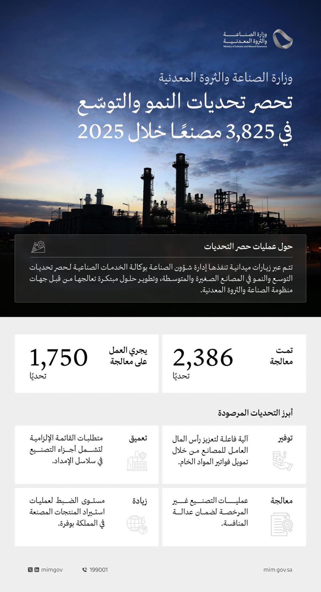 نفّذت وزارة الصناعة والثروة المعدنية زيارات ميدانية للمصانع متناهية الصغر والصغيرة والمتوسطة، شملت 3,825 زيارة ميدانية في 2025؛ لرصد وفهم تحديات التوسع والنمو للمصانع القائمة، والعمل على تطوير حلول مبتكرة تعالج تحديات تلك المصانع من قبل جهات منظومة الصناعة والتعدين، بما يحفّز توسعها ونمو منتجاتها، ويسهم في تعزيز التنمية الصناعية بالمملكة.