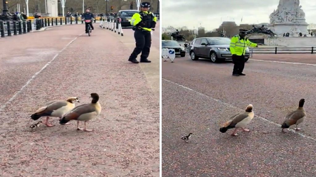 شهدت شوارع لندن مشهد لطيف لشرطة المرور البريطانية وهم يوقفون حركة السير مؤقتًا أمام قصر باكنغهام بسبب بط.تلفزيون وفيديو