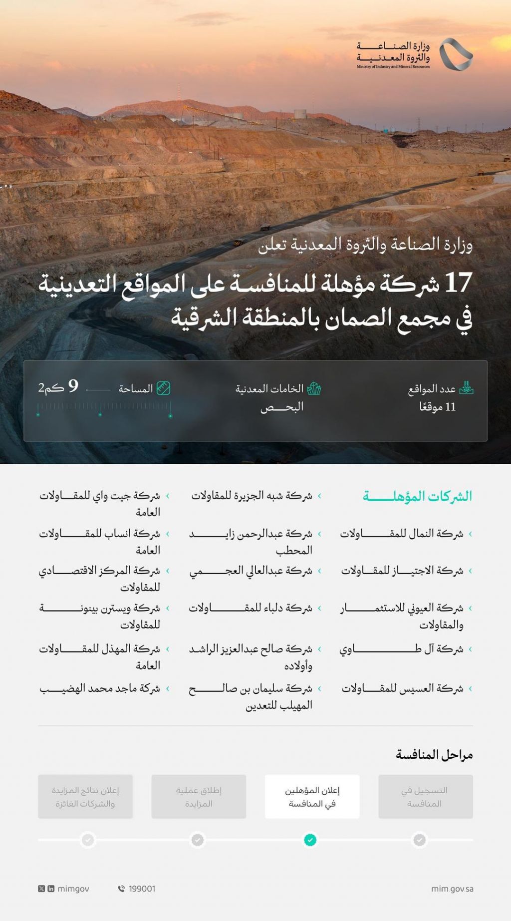 أعلنت وزارة الصناعة والثروة المعدنية عن تأهيل (17) شركة محلية للمنافسة على (11) موقعًا تعدينيًّا في مجمع كسارات الصمان بالمنطقة الشرقية، مخصّصة لاستغلال خام البحص وتبلغ إجمالي مساحتها (9) كيلومترات مربعة، وذلك في إطار جهود الوزارة لاستغلال الخامات المعدنية الداعمة لقطاع البناء والتشييد والمشاريع التنموية بالمملكة.