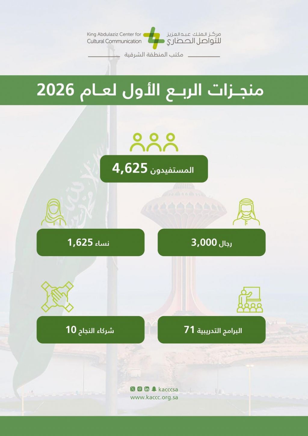 اختتم مكتب مركز الملك عبدالعزيز للتواصل الحضاري بالمنطقة الشرقية برامجه للربع الأول من عام 2026م، حيث بلغ عدد المستفيدين من هذه البرامج 3,000 من الرجال و1,625 من النساء، بإجمالي 4,625 مستفيدًا، محققًا نسبة نمو بلغت 19% مقارنةً بالربع المماثل من العام الماضي.