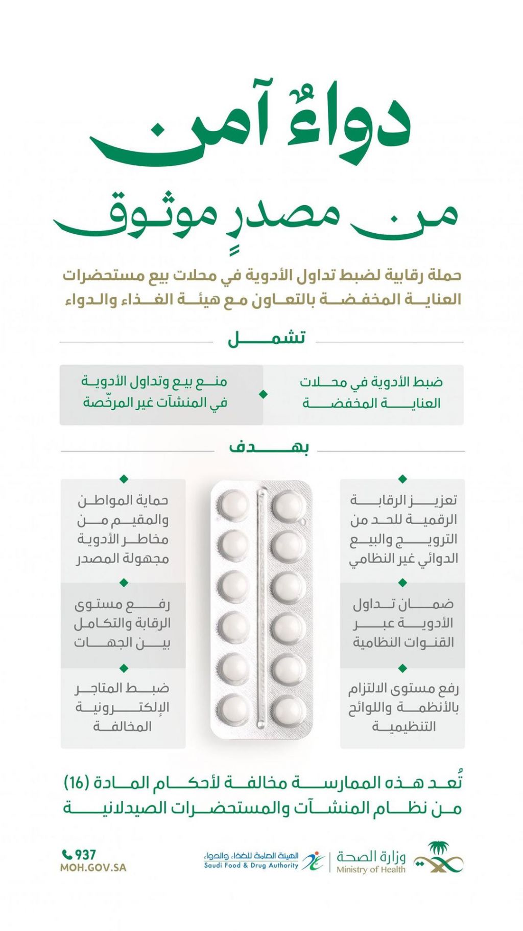 وتهدف الحملة إلى تعزيز الرقابة للحد من الترويج والبيع الدوائي غير النظامي، بما يسهم في تداول الأدوية عبر القنوات النظامية، ورفع مستوى الالتزام بالأنظمة واللوائح التنظيمية، بما يسهم في حماية المواطن والمقيم من مخاطر الأدوية مجهولة المصدر، وتعزيز التكامل الرقابي بين الجهات.