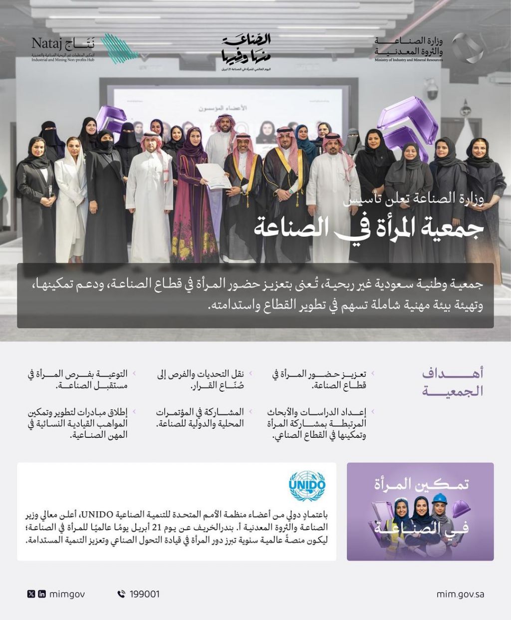 أعلنت وزارة الصناعة والثروة المعدنية عن تأسيس جمعية المرأة في الصناعة غير الربحية؛ التي تستهدف تمكين المرأة وتوسيع مشاركتها في القطاع الصناعي بالمملكة، تزامنًا مع اليوم العالمي للمرأة في الصناعة، وذلك في إطار جهود الوزارة لتمكين المنظمات غير الربحية في قطاعي الصناعة والتعدين، إيمانًا بدورها في دعم التنمية الاقتصادية والاجتماعية بالمملكة.