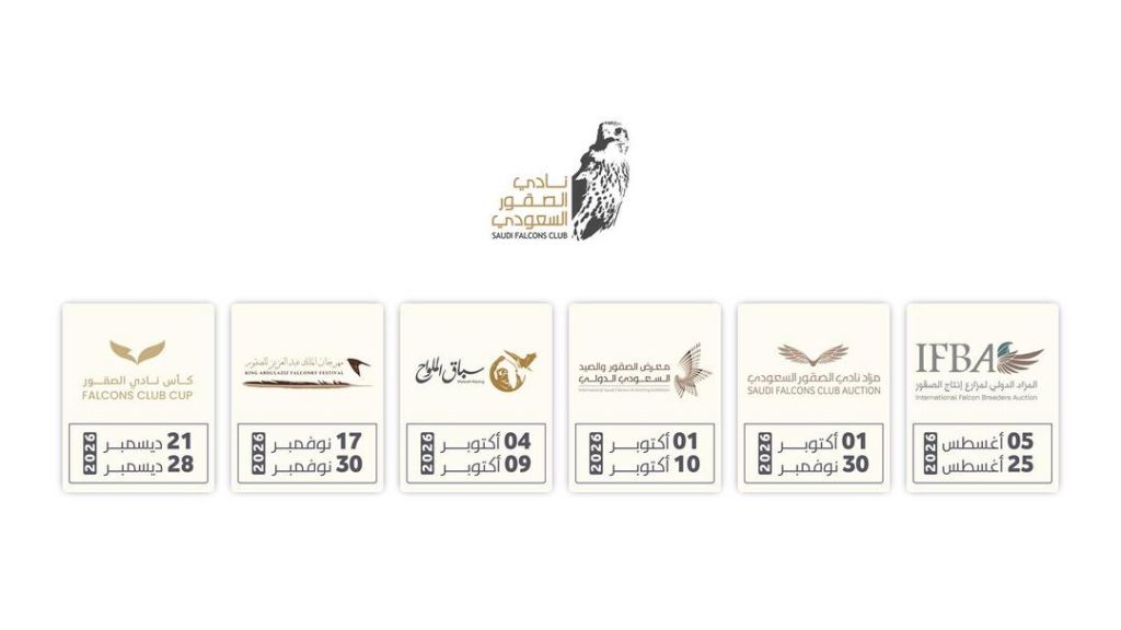 أعلن نادي الصقور السعودي مواعيد فعالياته الرئيسية لعام 2026، التي تتضمن مهرجانًا، ومزادين، ومعرضًا، وسباقًا للملواح، وبطولة كأس نادي الصقور.